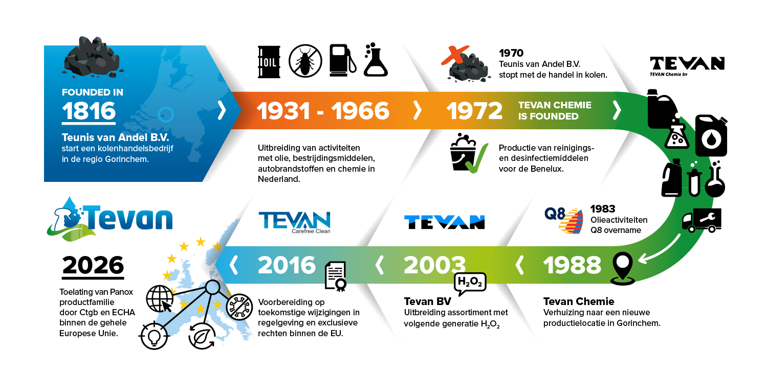 Tevan bestaat al sinds 1816 en is dan ook het oudste bedrijf in de stad Gorinchem. Sinds 1978 houden wij ons bezig met het produceren van reinigings- en desinfectiemiddelen. In de afgelopen 40 jaar hebben wij ons weten te positioneren als toonaangevend producent op het gebied van reiniging en desinfectie. Dit hebben we gedaan door continue innovatie en het perfectioneren van onze producten en processen. Zo zorgt Tevan samen met u voor een veilige en hygiënische omgeving.