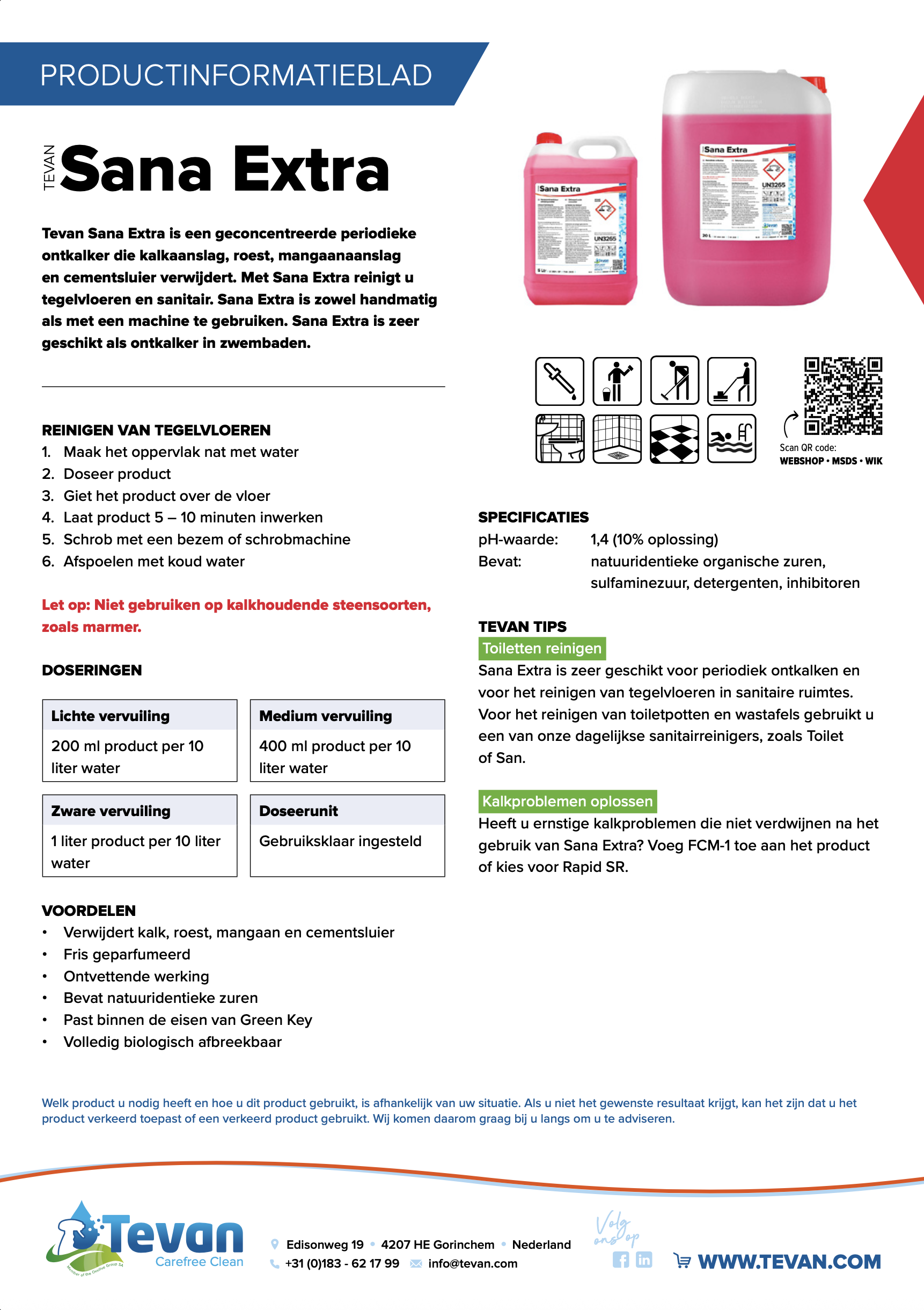 Tevan Sana Extra is een geconcentreerde periodieke ontkalker die kalkaanslag, roest, mangaanaanslag en cementsluier verwijdert. Met Sana Extra reinigt u tegelvloeren en sanitair. Sana Extra is zowel handmatig als met een machine te gebruiken. Sana Extra is zeer geschikt als ontkalker in zwembaden.